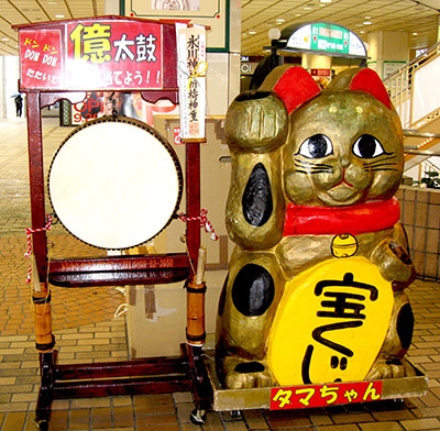 億太鼓の横では、皆様に幸運を招く縁起のよい猫(タマちゃん)がお出迎え!