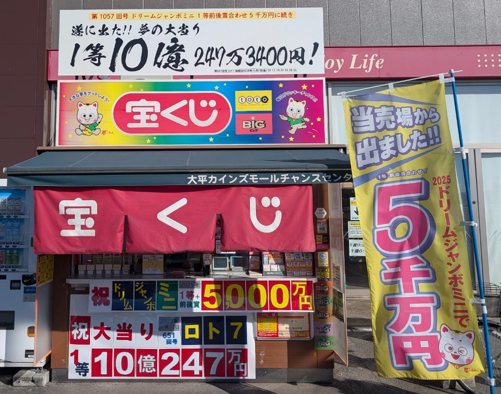 2025年ドリームジャンボミニ 1等前後賞合わせて5,000万円に続き、栃木県内初、2025年11月にロト7 1等10億247万円の高額大当たりが出ました。2019年の台風19号で被災し当売場も流される寸前、電線1本でつなぎ止められた強運の売場に販売員の笑顔が幸運を呼び込んでいます。ぜひ皆さまのご来店お待ちしております。