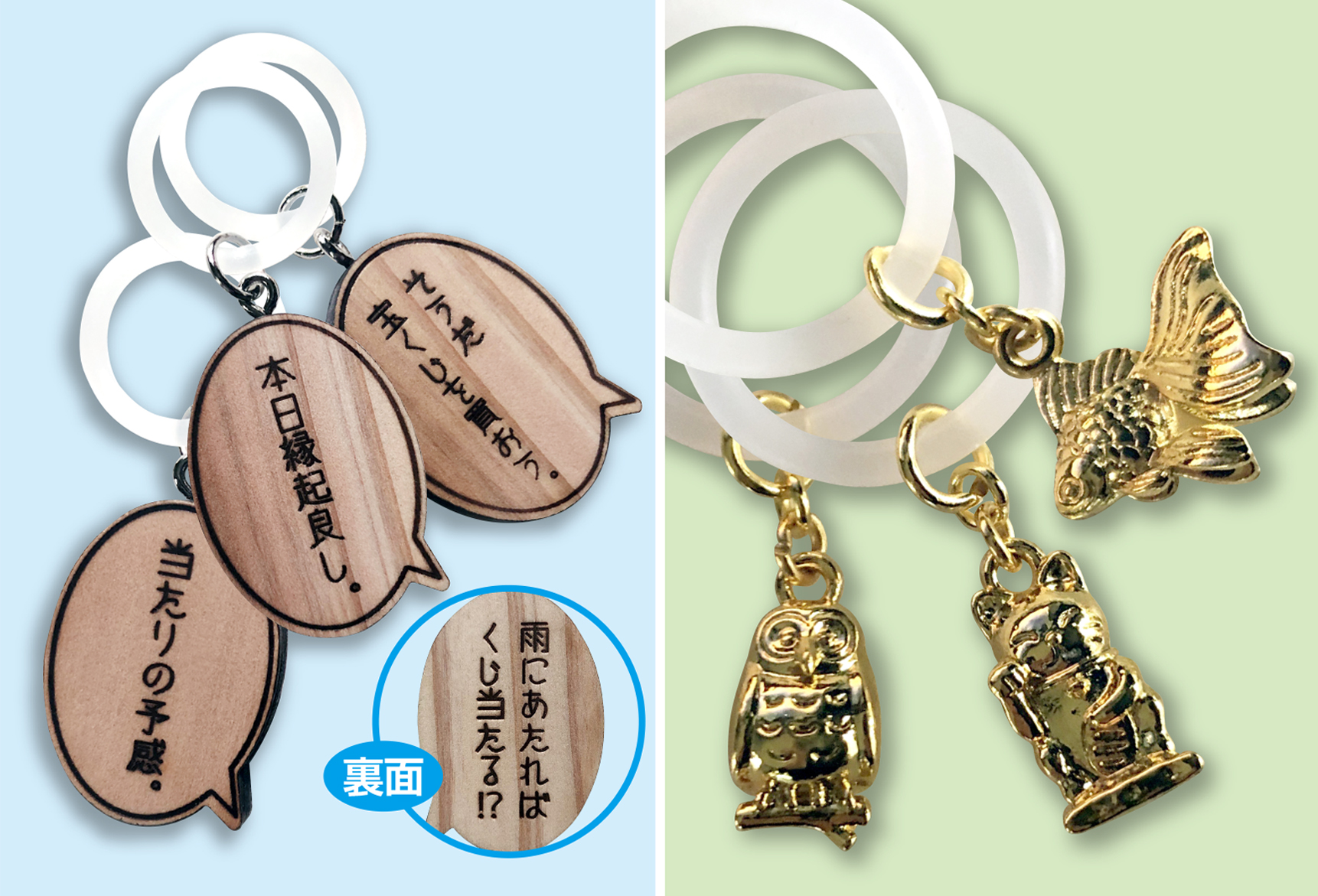 傘やマイボトルに取り付けるオシャレな目印。「雨にあたれば、くじ当たる」メッセージ入りの杉材を使用した木製タイプと、輝く黄金の縁起物デザインの立体合金製タイプの2種類は1袋各3種入り。