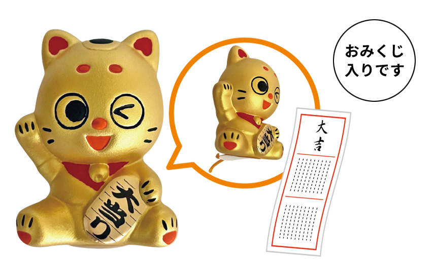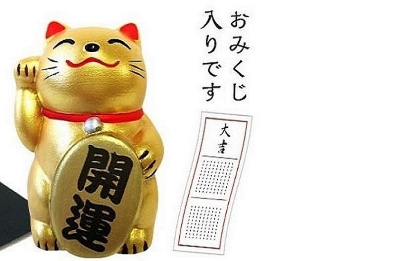 猫の右手は金運を招く。風水で金色は金運、加えて「開運小判」も抱えたトリプル効果の縁起もの。(おみくじ入り)