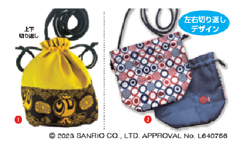 紺&白の金運柄(きんぎょ堂本舗)と黄&茶の打ち出の小槌柄デザイン。「洗える巾着」は2WAYで「ポシェット」にもなる優れもの。和装と洋装の両方の生活シーンで使用できます。ポリエステル素材