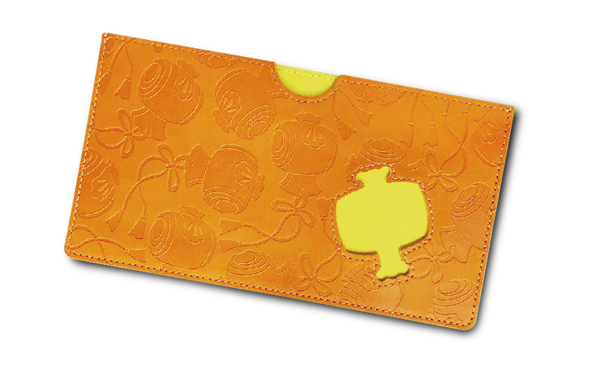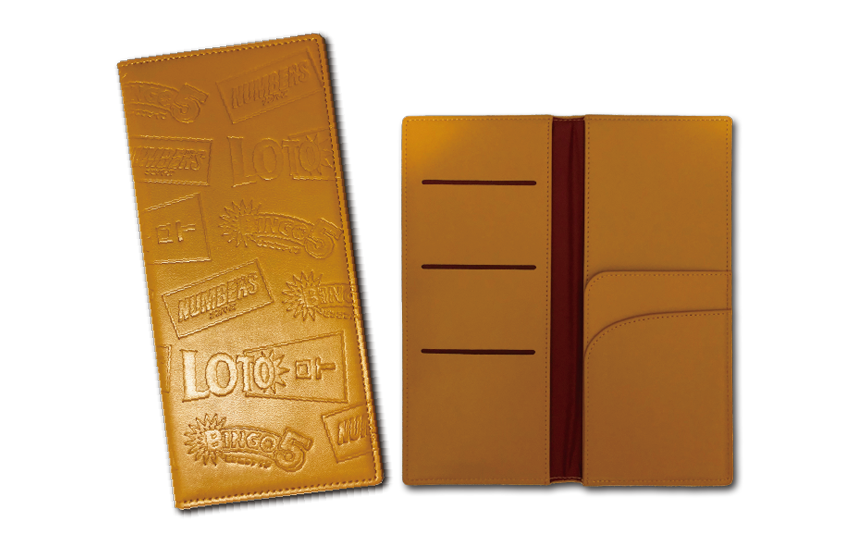 高級感ある合皮製。打ち出の小槌模様の型押しで、宝くじ10袋(100枚)を収納可能。上着の内ポケットにも入るサイズです。