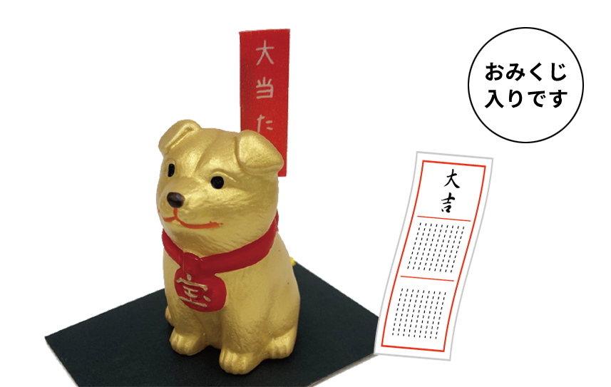 宝くじチャンスセンターオリジナル!開運招福「金色の縁起物」左手には大当りの小判、右手を上げて金運を祈願!最下部におみくじ入り。