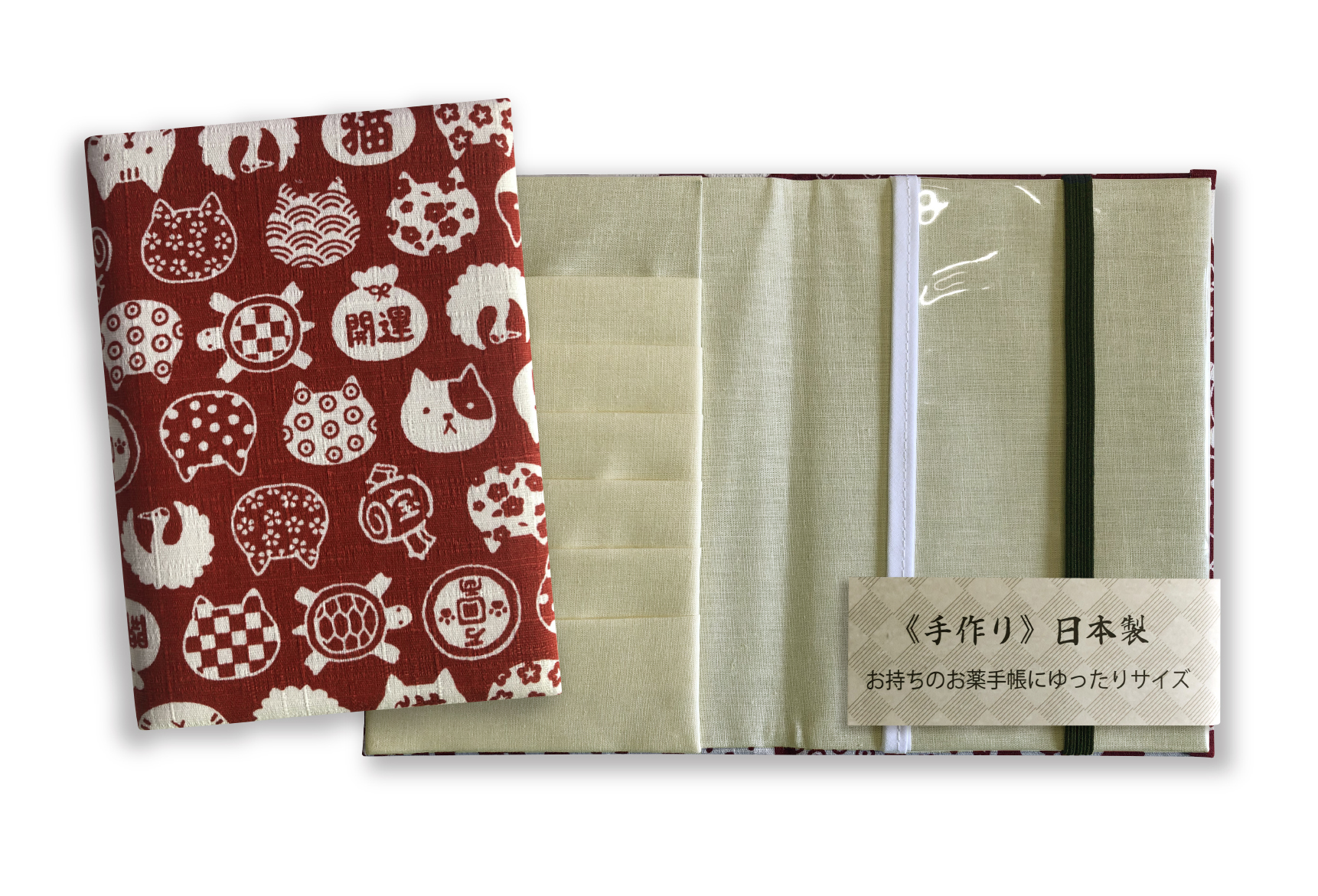 ご長寿健康運の鶴亀と、金運・招き猫。綿100%(表地)の素材でぬくもり感いっぱい。日本製手作りの民芸品として、チャンスセンターオリジナル限定品。お手持ちのお薬手帳にゆったりサイズ。