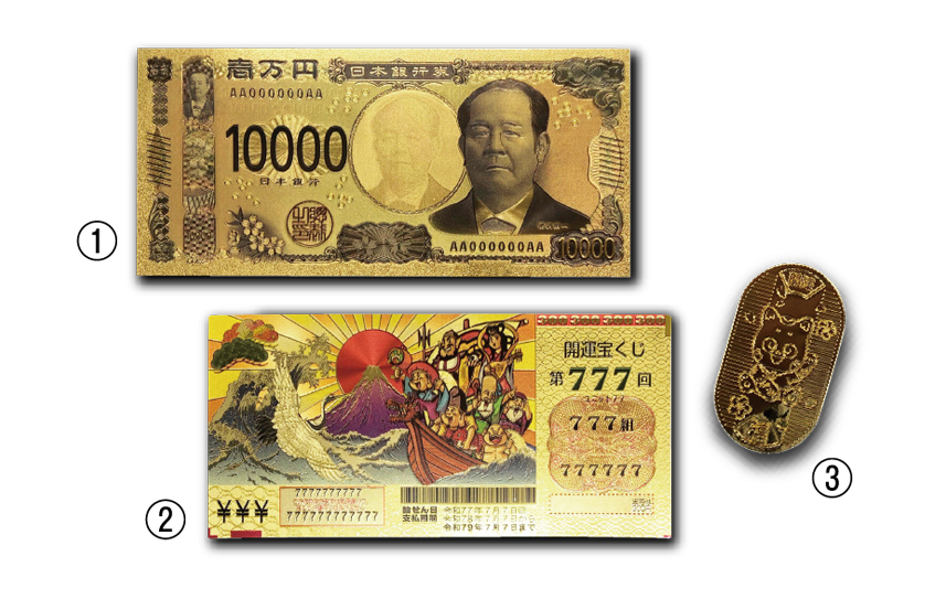 縁起物玩具の3点セット。①新壱萬円札(渋沢栄一)の護符、②宝くじ護符、③夢~たん小判、の3点セット。