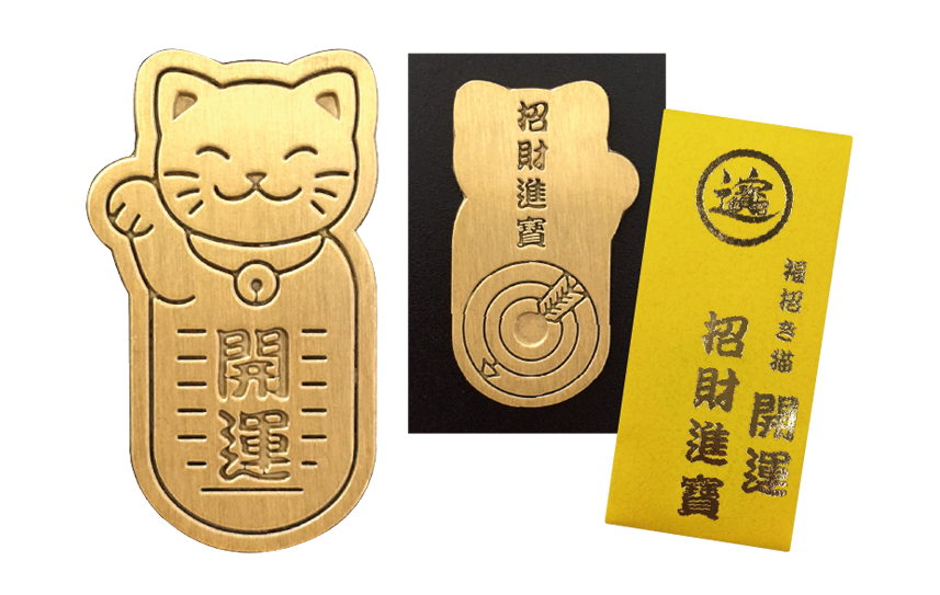 財布にしまって金運招く。重厚な金属の質感。スクラッチくじを削るのに最適の一品。これで削って縁起を担いでみては。「お包み」もお守り風=柱の恵方に貼って金運祈願!「招財進寶」は一言で発財や吉祥を表します。