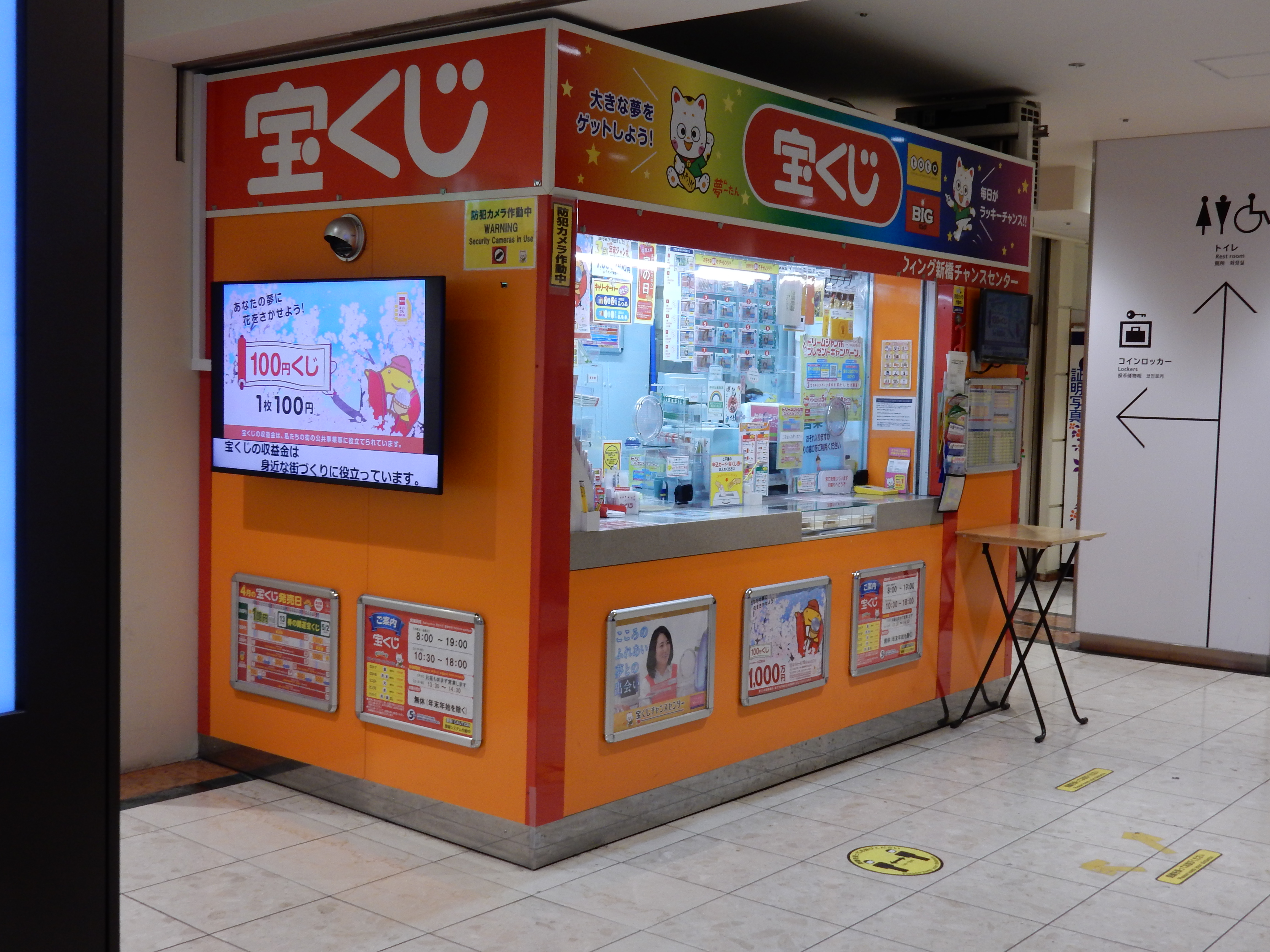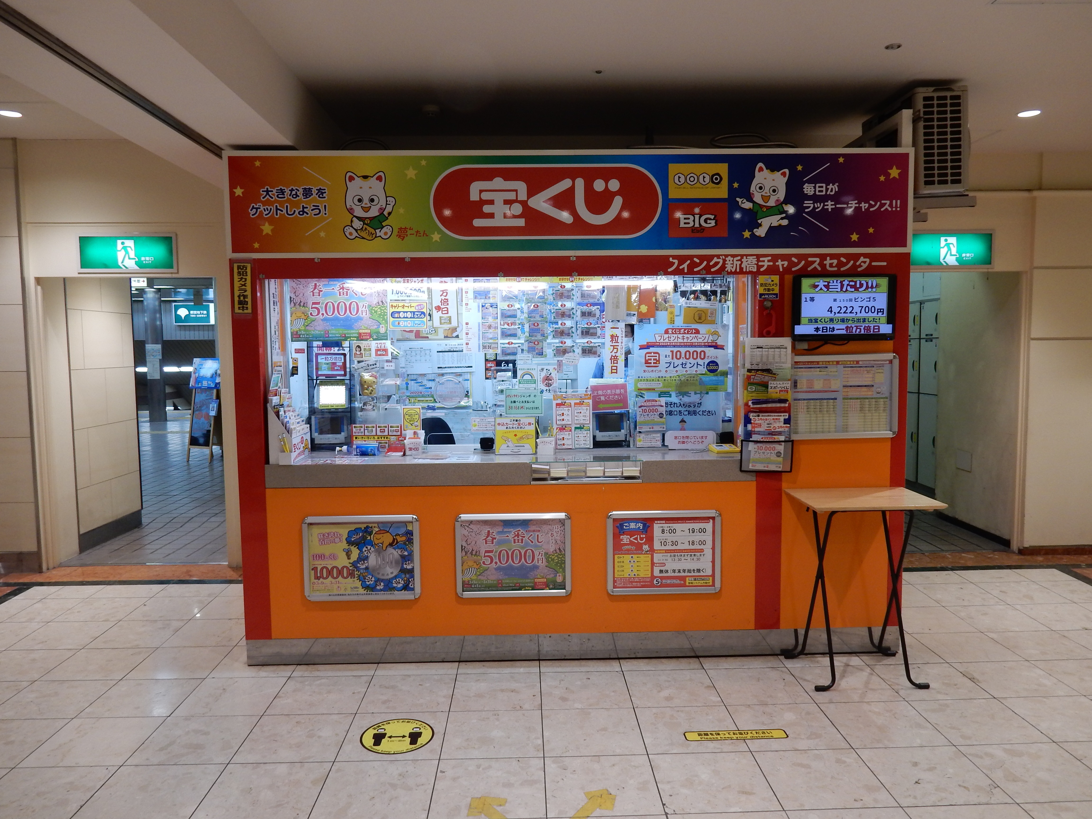 1983年の開店以来長きにわたり平日は午前8時から営業してサラリーマンや市場関係者の皆さまからご愛顧頂いている売場です。売場の場所はJR新橋駅汐留口から都営浅草線汐留駅の間の地下街の一画で、新橋地区№1パワースポットの烏森神社と無病息災祈願で有名な日比谷神社、そして縁起の良い樹齢300年を超す都内最大の黒松のある浜離宮恩賜公園のトライアングルに囲まれて運気が集まっているエリア内にあり、2022年8月にはロト6で1等3億4千万円が出ました。皆さまのご来店をお待ちしております。