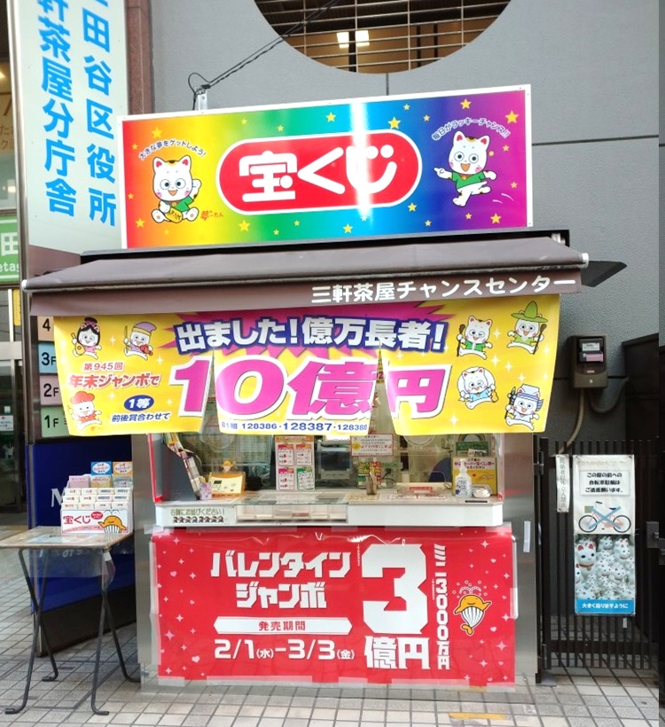 東急田園都市線の三軒茶屋駅北口Aを出て茶沢通りを右に行った世田谷区三軒茶屋分所入口横に売場はあります。1999年10月に開業して以来、長年にわたりお客さまからご愛顧いただき、多くの高額当せん者を輩出している人気の宝くじ売場です。また、東急世田谷線で20分ほど行ったところには開運招来「招き猫」で有名なパワースポット豪徳寺があります。あなたもぜひ一度豪徳寺を参拝し、宝くじで大きな夢を叶えてみませんか!!