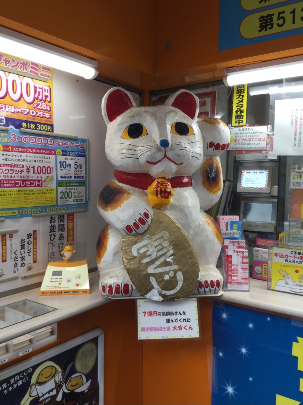 近年お客さまにはおなじみとなっている招き猫の「大吉君」は2019年に元いた売場の移転に際し清瀬CCに引越して来ました。元の売場でも年末ジャンボ7千万円他、数多くの高額当選を招いた猫として愛されていたのですが、清瀬CCに引越した途端、2020年サマージャンボで1等7億円(前後賞含む)の高額当選が出たのです!「大吉君の招く幸運に期待が膨らむ清瀬チャンスセンター!」