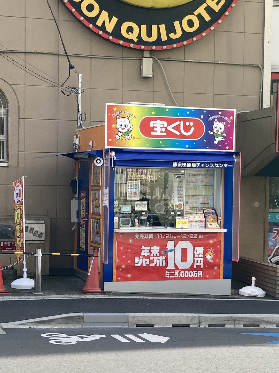 昭和の面影を残すJR藤沢駅南口、江ノ島電鉄、小田急江ノ島線藤沢駅から徒歩1分の人気店。常連のお客様に加え、買物客や通勤客で賑う売場です。駅へ繋がる道路際にあり、大きな丸いドンキのシンボルマークの下に、ドン・キホーテの壁面に隣接しています。江ノ電で来られるお客様も多く、藤沢駅は、江ノ島水族館、江ノ島、江ノ島海岸へ電車で往復する方々がよく利用します。潮風を求めて海に夢を、幸運を求めて宝くじに夢を、売場一同笑顔でお客様をお出迎えします。