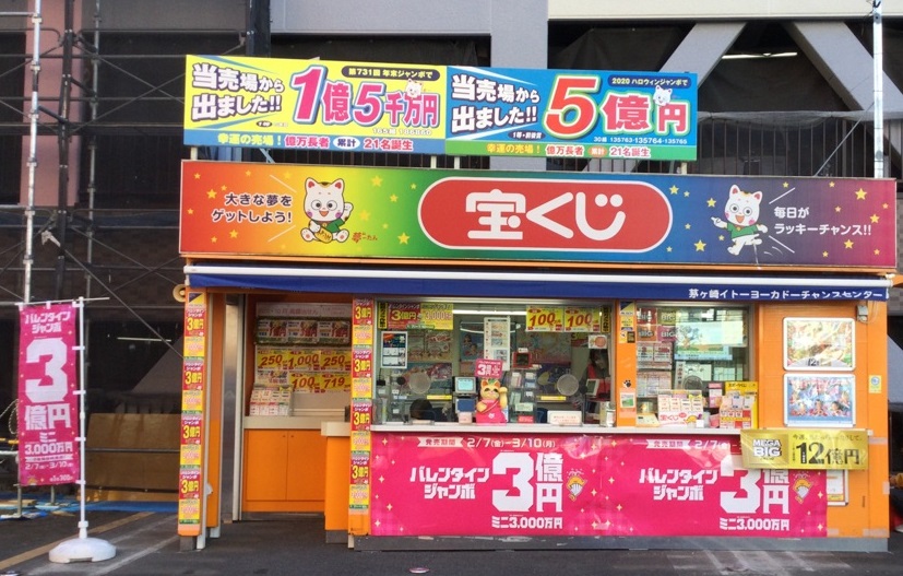JR茅ケ崎駅北側、BLiX茅ヶ崎と新装ヤマダ電機の間にある売場です。駅の向こう側サザン通りを進むとサザンビーチには、波を求めてサーファーが集まります。湘南のサザンの波に乗り運気上昇! 2020年大当たりの女神がやってきた! ハロウィンジャンボ1等前後賞含む5億円! 幸運の女神さま、更なる大当たりの旋風をどうぞお送りください。