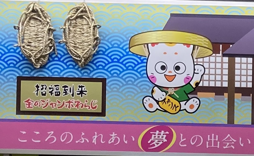 幸運の女神様にもご宿泊頂こうと黄金色の巨大ワラジを「シンボル」として売場に備え付けました。