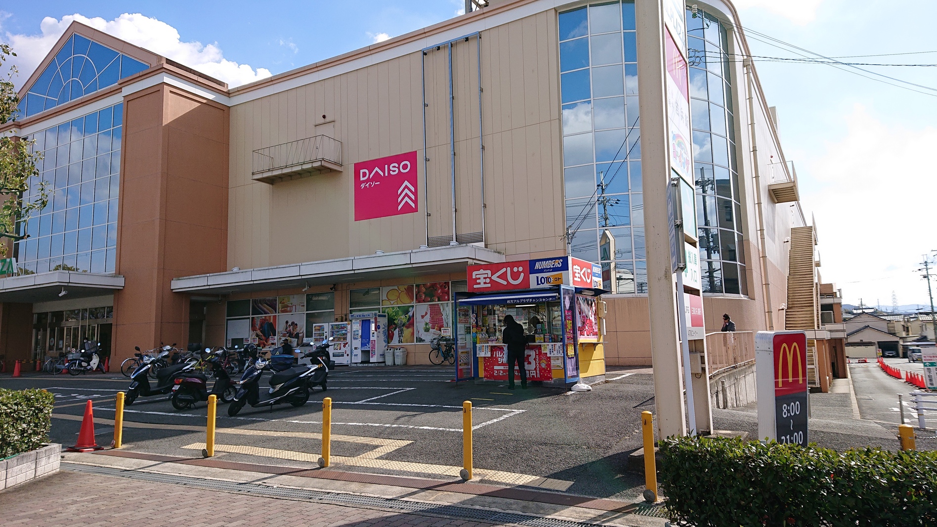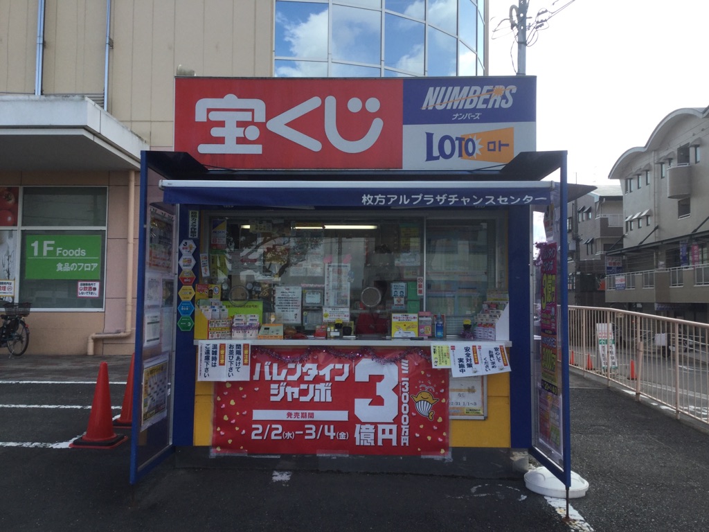 宝くじ売場は、アルプラザ枚方店の正面入口右側にあり、バス停からも近く車がなくても便利な場所にあります。また、アルプラザ店の駐車場は広いので車でご来店のお客様も便利な売場です。当売場は、過去には年末ジャンボで7億円をはじめ100万円以上の高額当選がたくさんでております。あなたも是非、億万長者の夢を掴んでください。真心と明るい笑顔で皆様をお待ちしております。