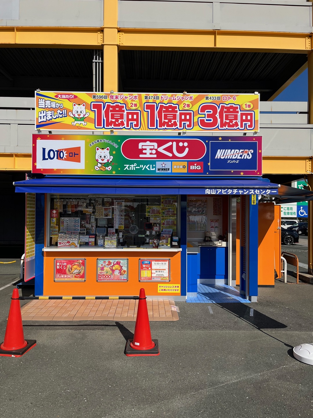 豊橋駅から東に約2キロ、春先は梅園そして桜が満開となる向山緑地公園に隣接するアピタ向山店内のチャンスセンターです。豊橋地区では最古・40年以上の歴史があり、2004年以降は1000万円を超える高額当せんは19本もあり、高額当せん売場としてジャンボのみならず常に行列ができる人気の宝くじ売場です。