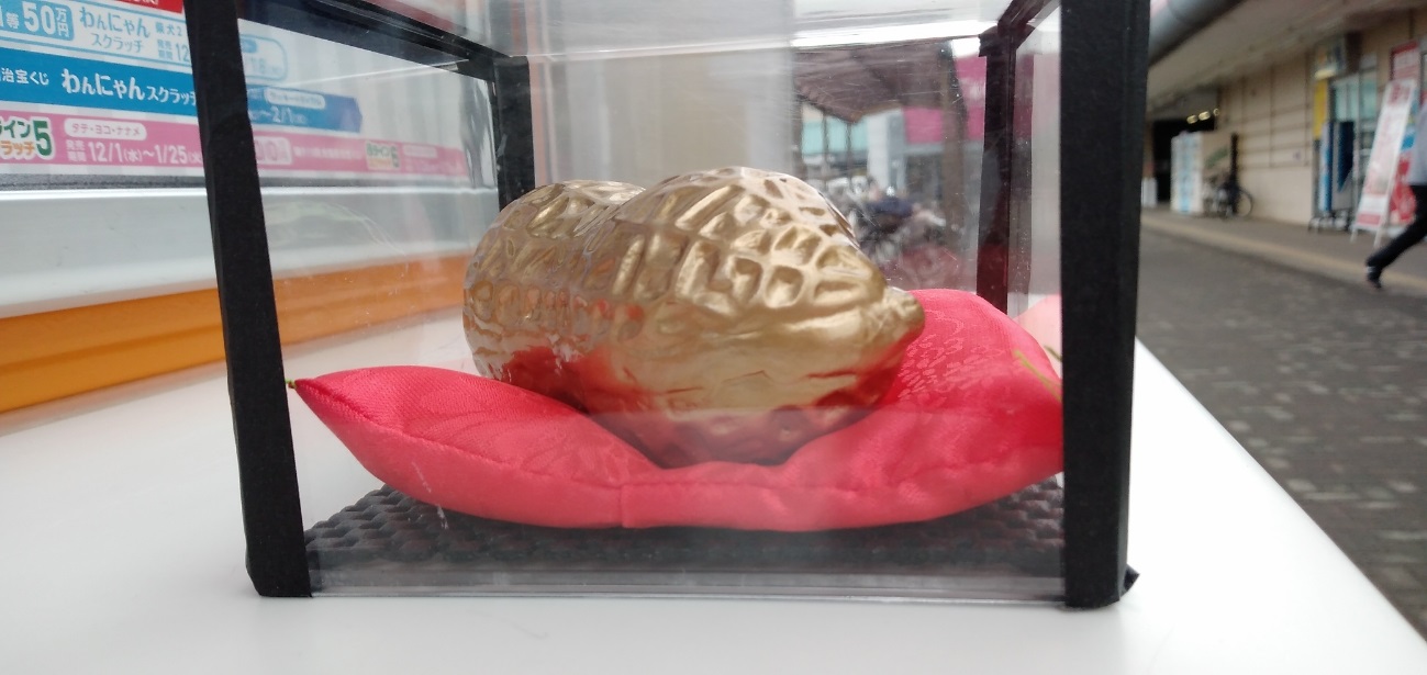 八街神社でご祈祷頂いた≪金の落花生≫が売場に鎮座しており、「ピーちゃん、ナッちゃん」と一緒に