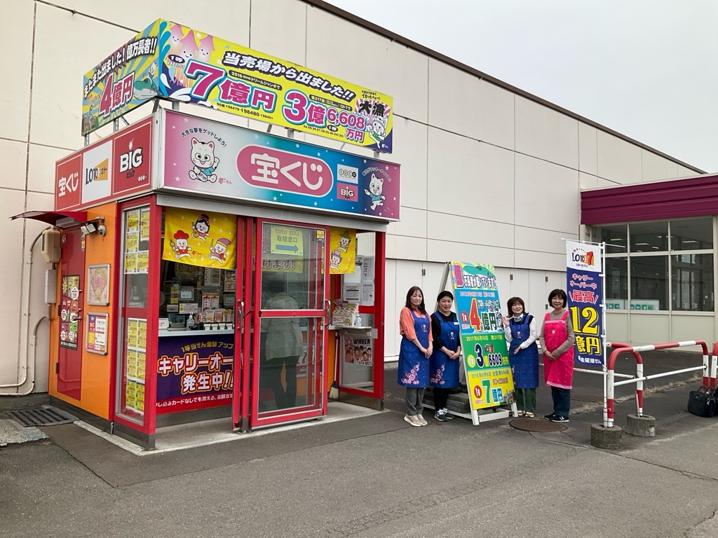 当売場は渡島檜山地区に大きな駐車場スペースを構える、イオン上磯店の敷地内に1998年12月開設。いつも多くの買い物客で賑わい、売場に宝くじを買いに来られるお客さまも多く、行列の絶えない大口売場です。