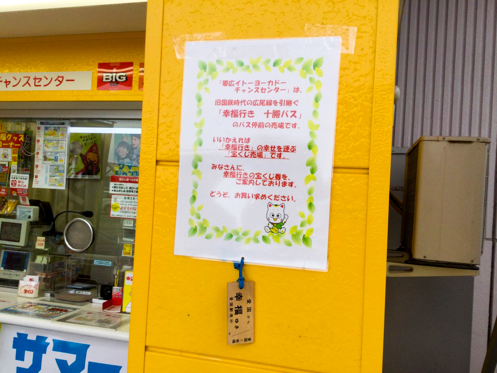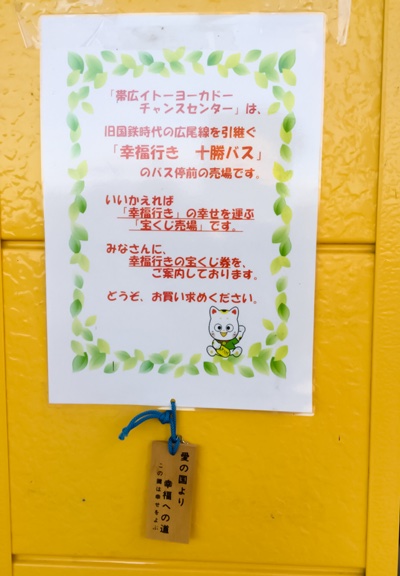 「当チャンスセンター」は、幸福駅で有名な旧国鉄時代の広尾線を引継ぐ「幸福駅行き 十勝バス」のバス停前にある売場であり、幸せを運ぶ「宝くじ売り場」です。