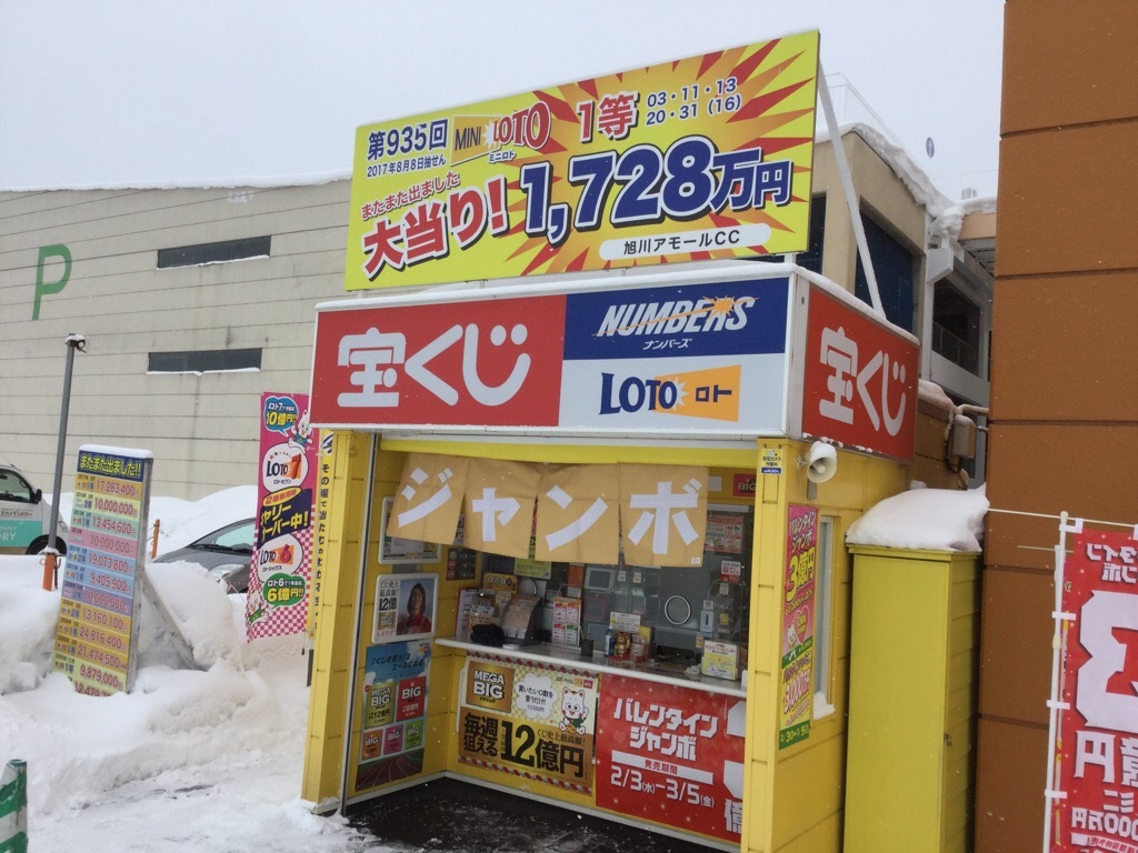 旭川駅前から四条通りを東へ車で15分程のところにある「アモールショッピングセンター」東口横にあるチャンスセンターです。