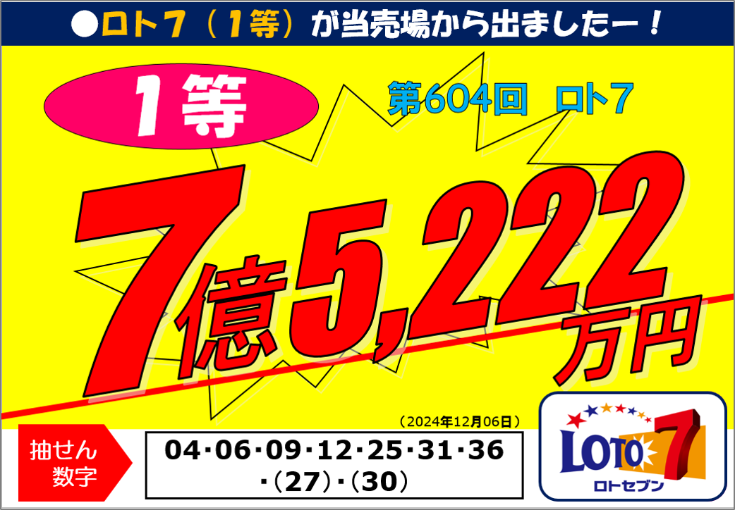 ロト7で1等の7億5,222万円の高額当せんが出ました!!
