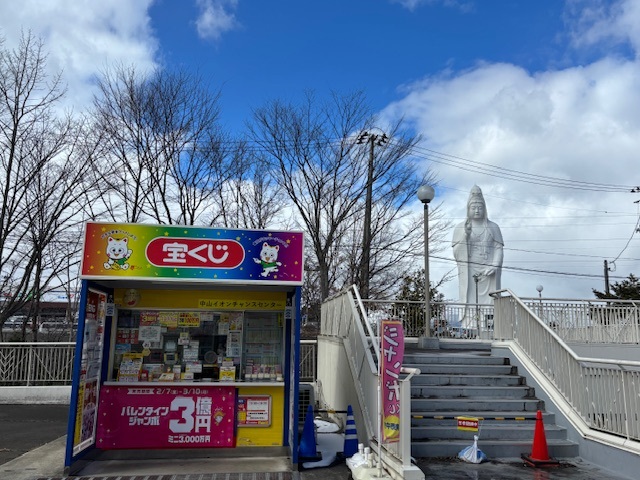 仙台市泉区の宮城県道37号仙台北環状線沿いに位置するイオン仙台中山店、3階の駐車場へ繋がる通路にある売場です。売場の脇の通路デッキからは、仙台市が一望できる絶景が広がっております。そして、売場のすぐ後ろには、かの有名な高さ日本一の観音様である『仙台天童白衣大観音』がやさしいまなざしで常に皆さまのご多幸を見守っておられます☆