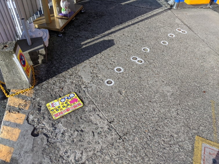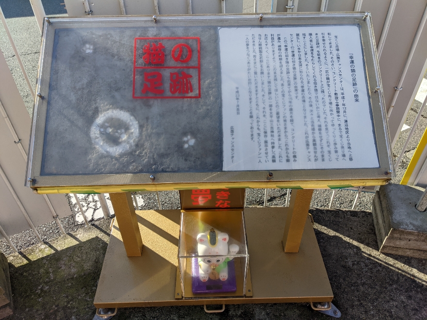 【幸運の猫の足跡の由来】当売場が現在の場所へ移転した際、一匹の猫がまるで引き寄せられたかのように足跡を生乾きのコンクリート上に残しました。猫は福を招き入れる生きものと言うこともあり、そのまま残すことにしました。そう致しましたらその後次々と当売場から高額当せんが誕生し、今や全国に知られる「幸運の売場」となり、広面チャンスセンターの「幸運の招き猫の足跡」伝説が生まれました。現在、当時の「猫の足跡」を太平山三吉神社にて「高額当せん継続誕生祈願」のうえ保存し、「ありがたいお印」として、ご利益を得ようと猫の足跡に宝くじをこすり付けて下さり、宝くじファンから愛されております。