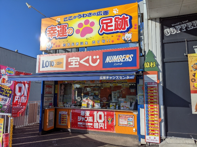 県内最大の高額当せん売場。売場前には猫の足跡が残っており「幸運の猫の足跡」として崇められており、今も数多の幸運を招いてくれています。1995年当地へ移転以来、億万長者17名様誕生!!当せん金額合計も29億円となっております。