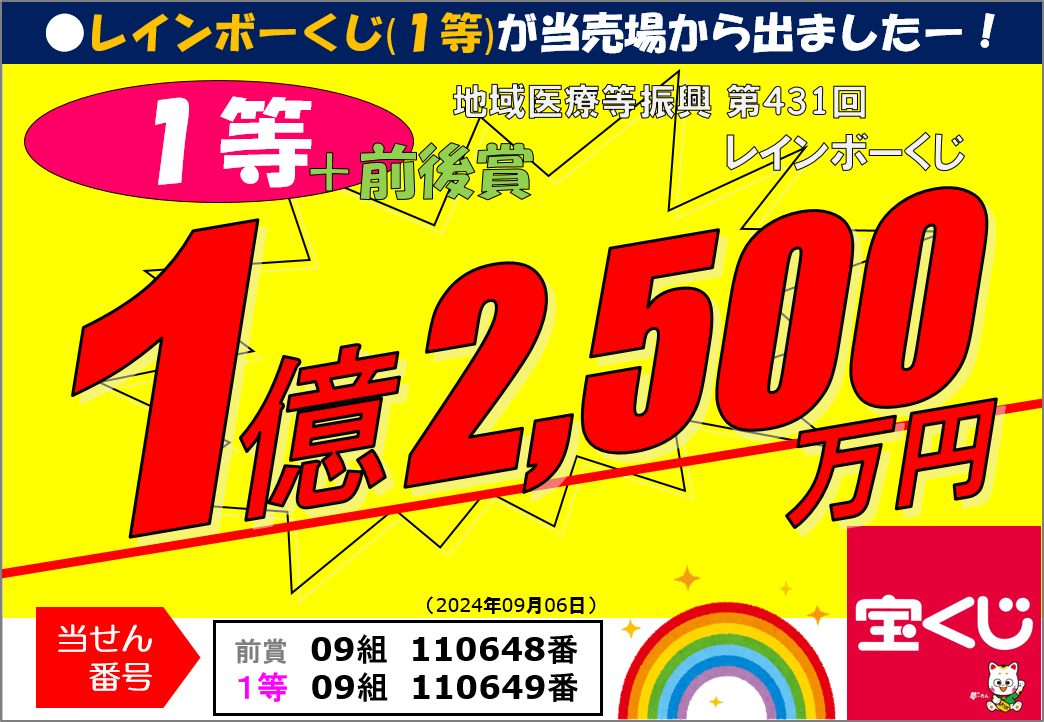 関東三大厄除けの一つ佐野厄除け大師近くの佐野フレッセイチャンスセンターでは全国893回サマージャンボミニ1等前後賞合わせて5,000万円、さらに第431回レインボーくじ(2024年9月6日抽せん)で1等前賞合わせて、1憶2,500万円の高額当せんが出ました。皆さまのご来店心よりお待ちしております。