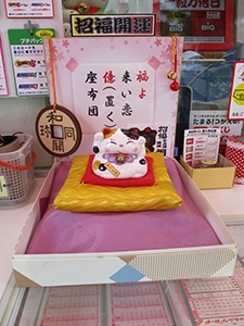当売場は、さいたま新都心駅、さいたまスーパーアリーナ・ショッピングモール「コクーンシティ」が隣接するビッグカメラ1階、入口にある売場です。売場には億万長者が誕生するようにと願を込めた『福よ来い恋、億(置く)座布団』を設置し、ご購入されたくじ券を座布団に乗せ高額祈願をしていただいております。皆さまのご来店を心からお待ちしております。