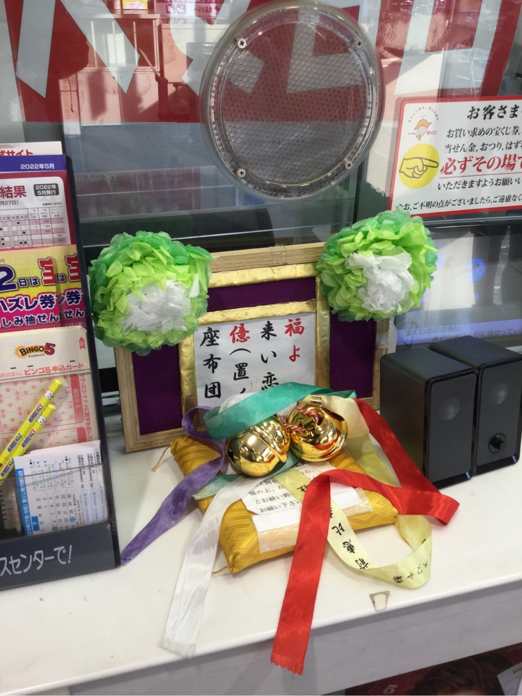 売場には億万長者が誕生するようにと願いを込めた『福よ来い恋、億(置く)座布団』を設置して、ご購入されたくじ券を座布団に乗せ高額当せん祈願をしていただいております。皆様のご来店を心よりお待ちしております。
