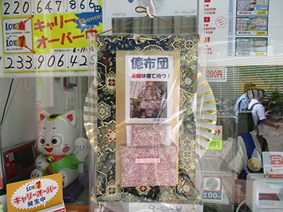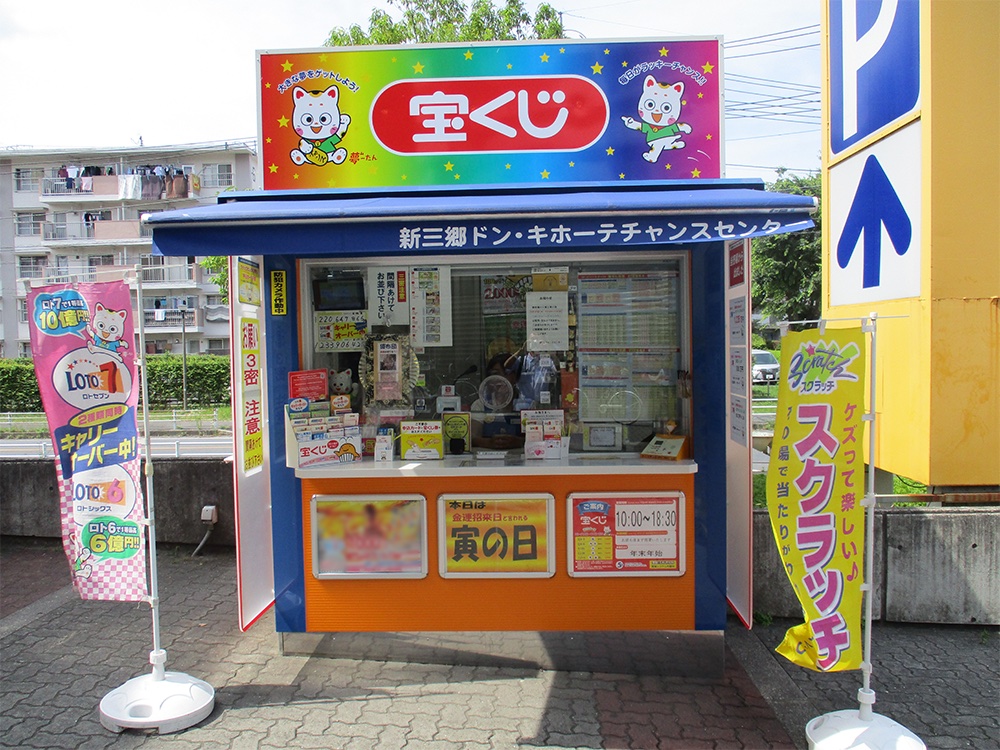 当売場は、JR武蔵野線新三郷駅から、約1㎞に位置するMEGAドン・キホーテ三郷店の店先にあります。開店して30年以上になり、おかげさまで多くのお客さまにご来店をいただいております。『果報は寝て待て』と言われます。売場には、億円台の当せんが当たりますようにと『億布団』を掲げております。是非、皆さま方に高額当せんが当たりますようにと心からご来店をお待ちしております。是非お立ち寄りください。大きな駐車場がありますのでお車でのご来店にも便利です。