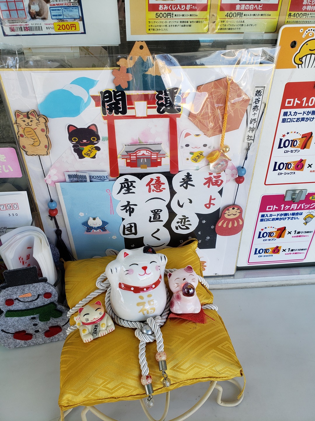 売場には億万長者が誕生するようにと願を込めた『福よ来い恋、億(置く)座布団』を設置し、ご購入されたお客さまが「高額祈願!」をしています。スタッフ一同皆さまの大当たりとご来店をお待ち申し上げております。