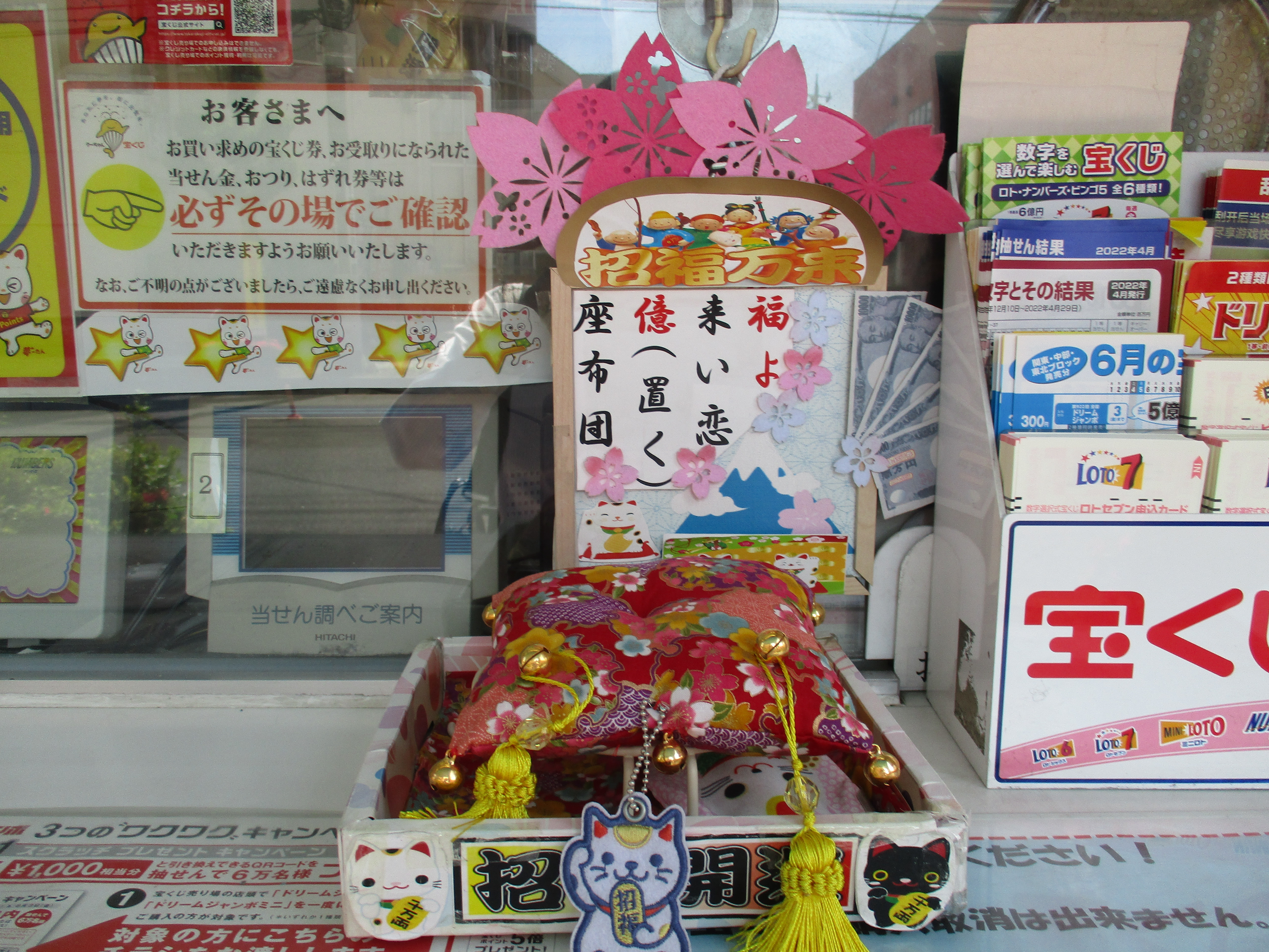 当店は、JR武蔵野線吉川駅から徒歩3分。ライフ(吉川駅前店)入り口にあります。開店して22年。売場には、億が当たりますようにと、『福よ来い恋、億(置く)座布団』を置いて皆さまのご来店を心からお待ちしております。買った宝くじを『億座布団』においてお祈りしたら、当たるようになりましたとの声もいただいております。是非、貴方も『億座布団』に宝くじを置いて、億円を狙いませんか!