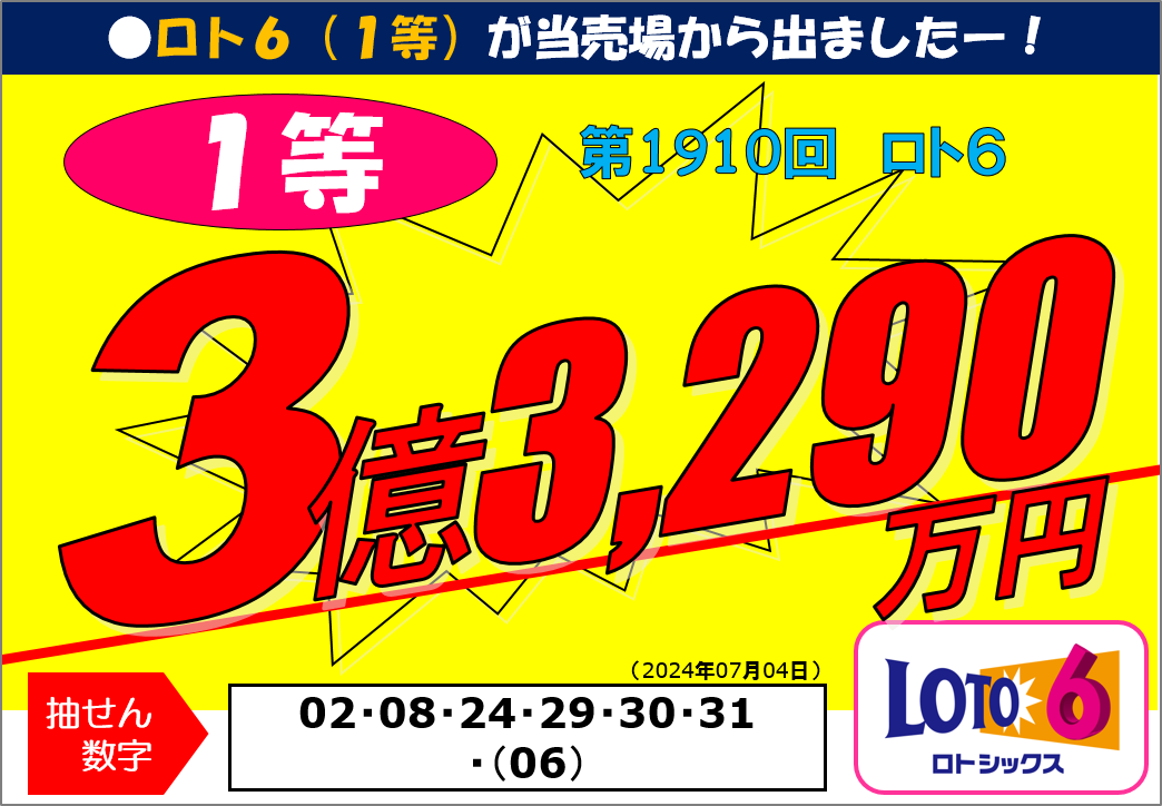 2024年7月、ロト6で1等3億3,290万円の大当たりが出ました!パワースポット効果かもしれません。