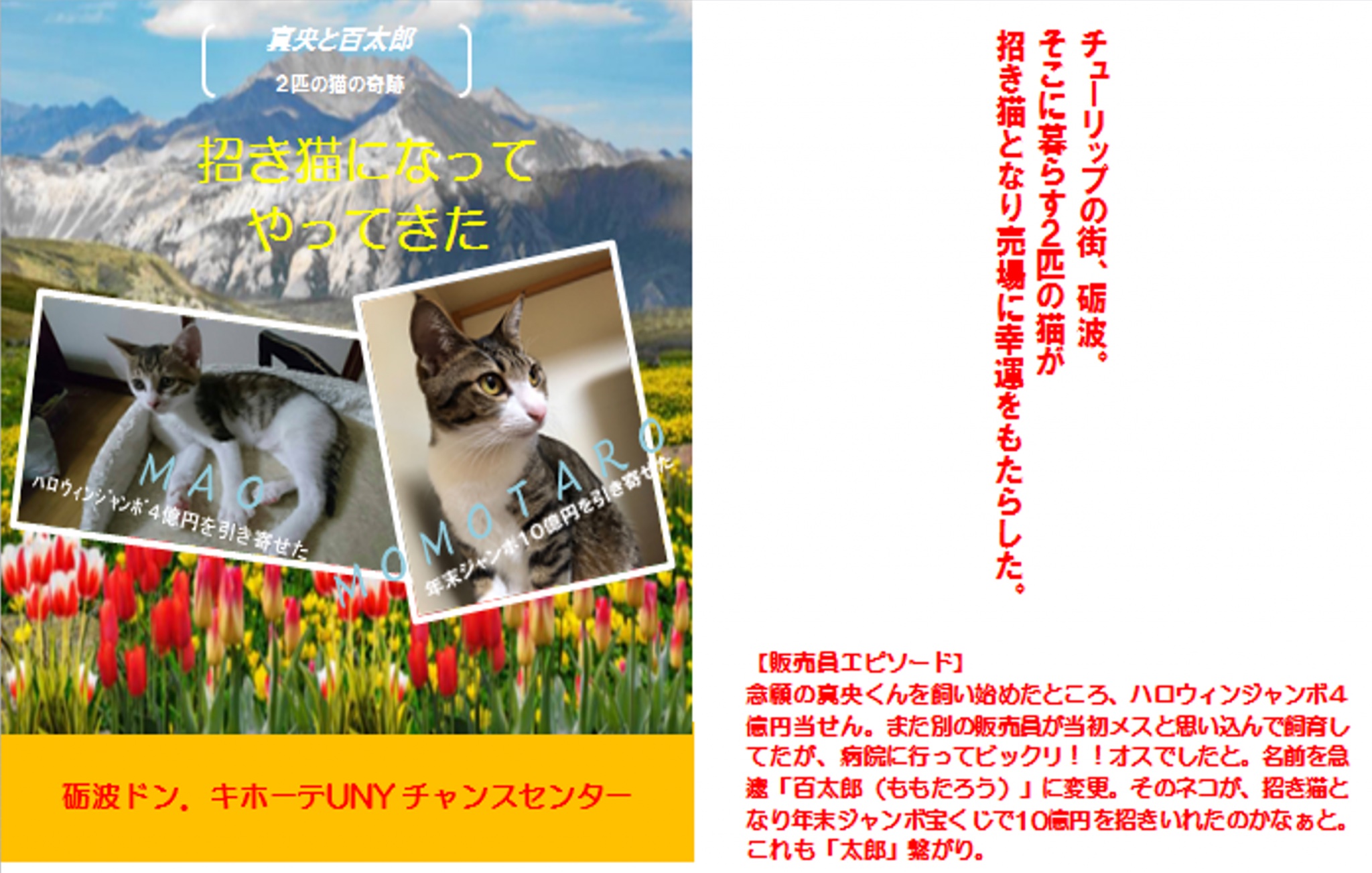 チューリップをモチーフにした「当せん祈願スタンプ」は、高額当せんが「当たった!」と幸運を招いてくれています。令和2年12月の年末ジャンボでは、富山県内初1等10億円(前後賞含む)高額当せんの快挙を成し遂げています。実は、高額当せんには、もうひとつのエピソードがあります。