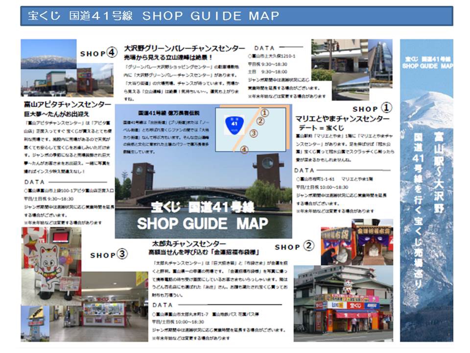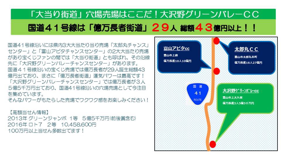 国道41号線沿いには県内3大大当たり当り売場「太郎丸チャンスセンター」と「富山アピタチャンスセンター」の2大大当たり売場があり宝くじファンの間では「大当り街道」とも呼ばれ、その沿線先に「大沢野グリーンバレーチャンスセンター」があります。国道41号線沿いの宝くじ売場では億万長者が29人誕生総額43億円出ており、まさに「億万長者街道」運気パワーは最高です!「大沢野グリーンバレーチャンスセンター」では億万長者が3人5億5千万円出ており、国道41号線沿いの穴場売場として今注を集めています。そんなパワーがもたらした売場でワクワク感をお楽しみください!