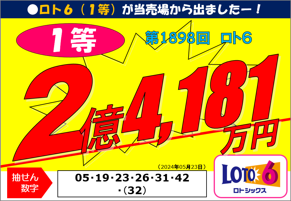 出ました!ロト6 1等 2億4,181万円‼ 入善町の町名の通り「入ります!善いことが」次はあなたにも入りますよ!