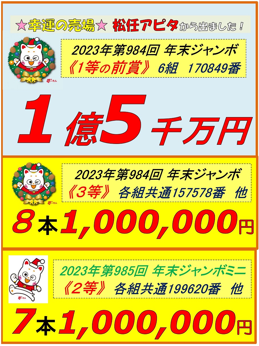 2023年12月の年末ジャンボで、1等の前賞 1億5千万円 が当せん。
