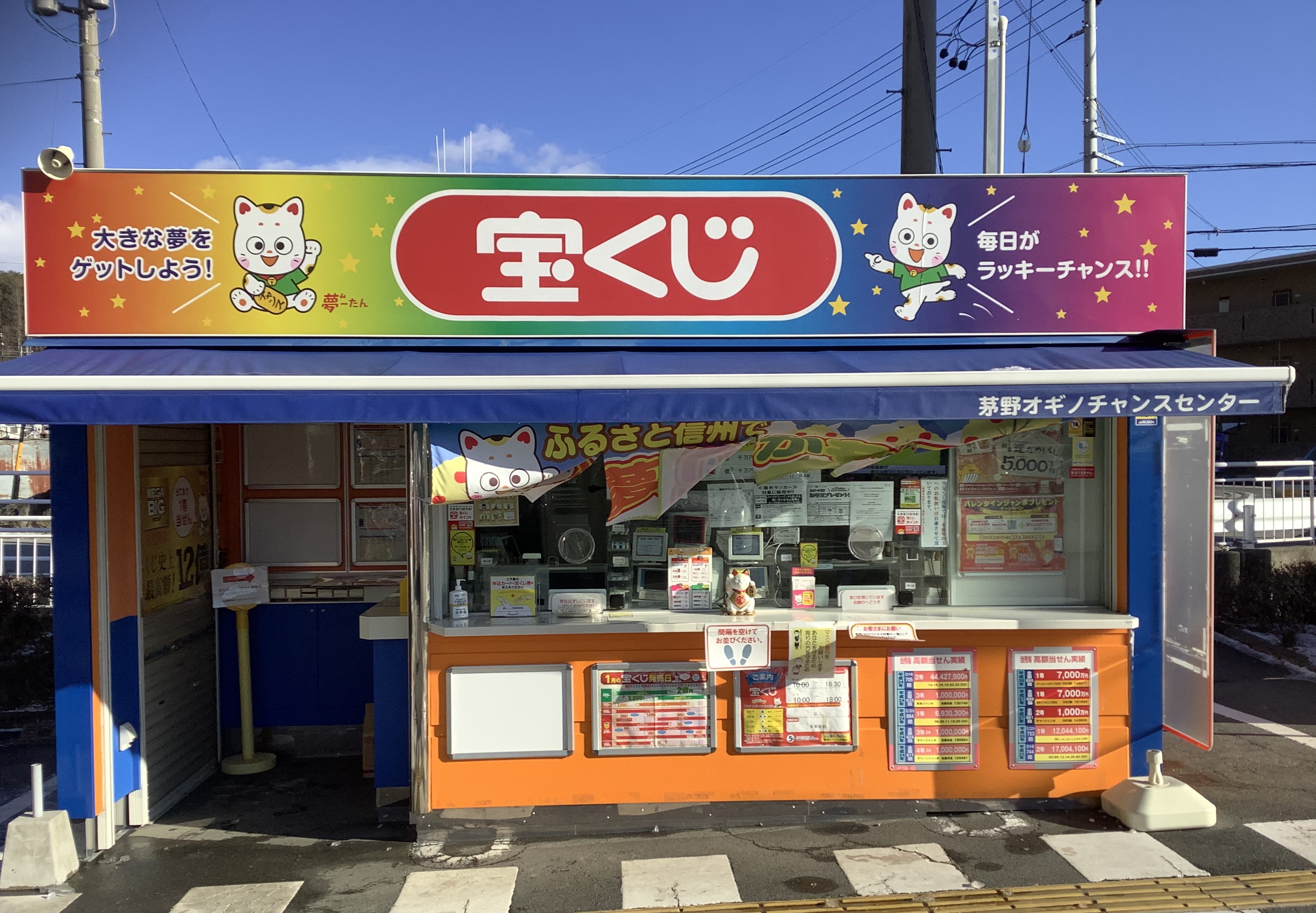 当売場は八ヶ岳を望む茅野市唯一の宝くじ売場で、全国的に有名な祭事が行われる木落とし公園近くのショッピングセンターの一画にあります。