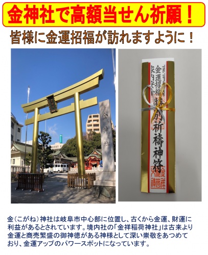 岐阜市中心部にある金色の鳥居で有名な金神社で「高額当せん祈願!」