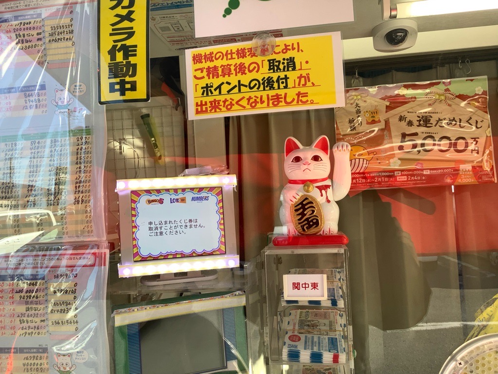 当店は人気の観光地「修善寺」からすぐそばの強運売場です。これまでも、ドリームジャンボで3億円、ロト7で10億円と2人の億万長者が誕生したほか、多くの強運を目撃してきました。販売員の話しによると、強運をつかんだお客さまは、必ず売場にいる「まねき猫」にお祈りをしてから購入するのだとか。