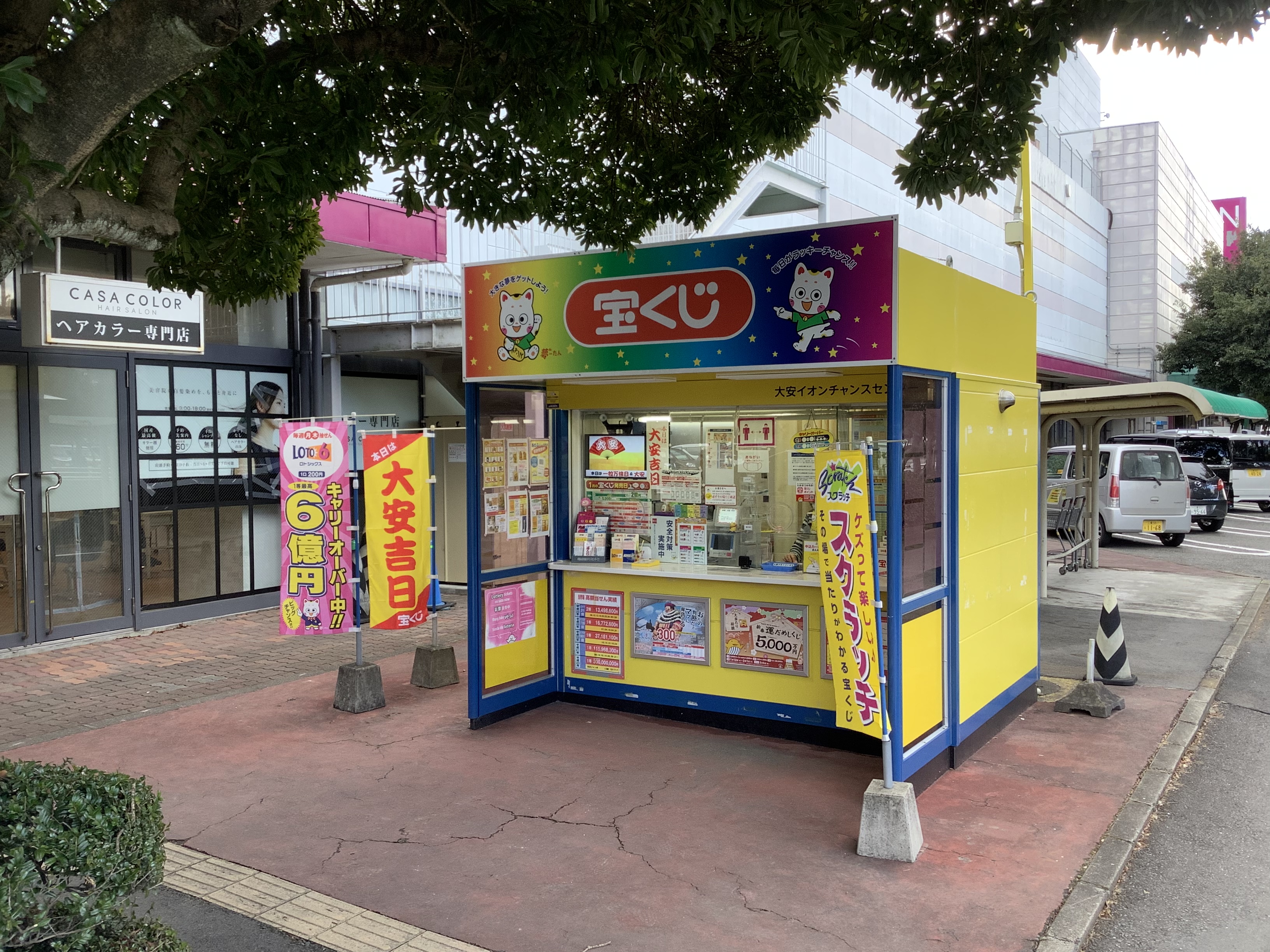 当宝くじ売場は、にぎわいの森がありカフェやギャラリーが集まるエリアから車で10分のイオン大安店の西入口横にあります。