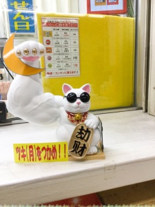 ツキをつかめ!屈強な腕を持つ白ニャンコが皆さまのご来店をお待ちしております。