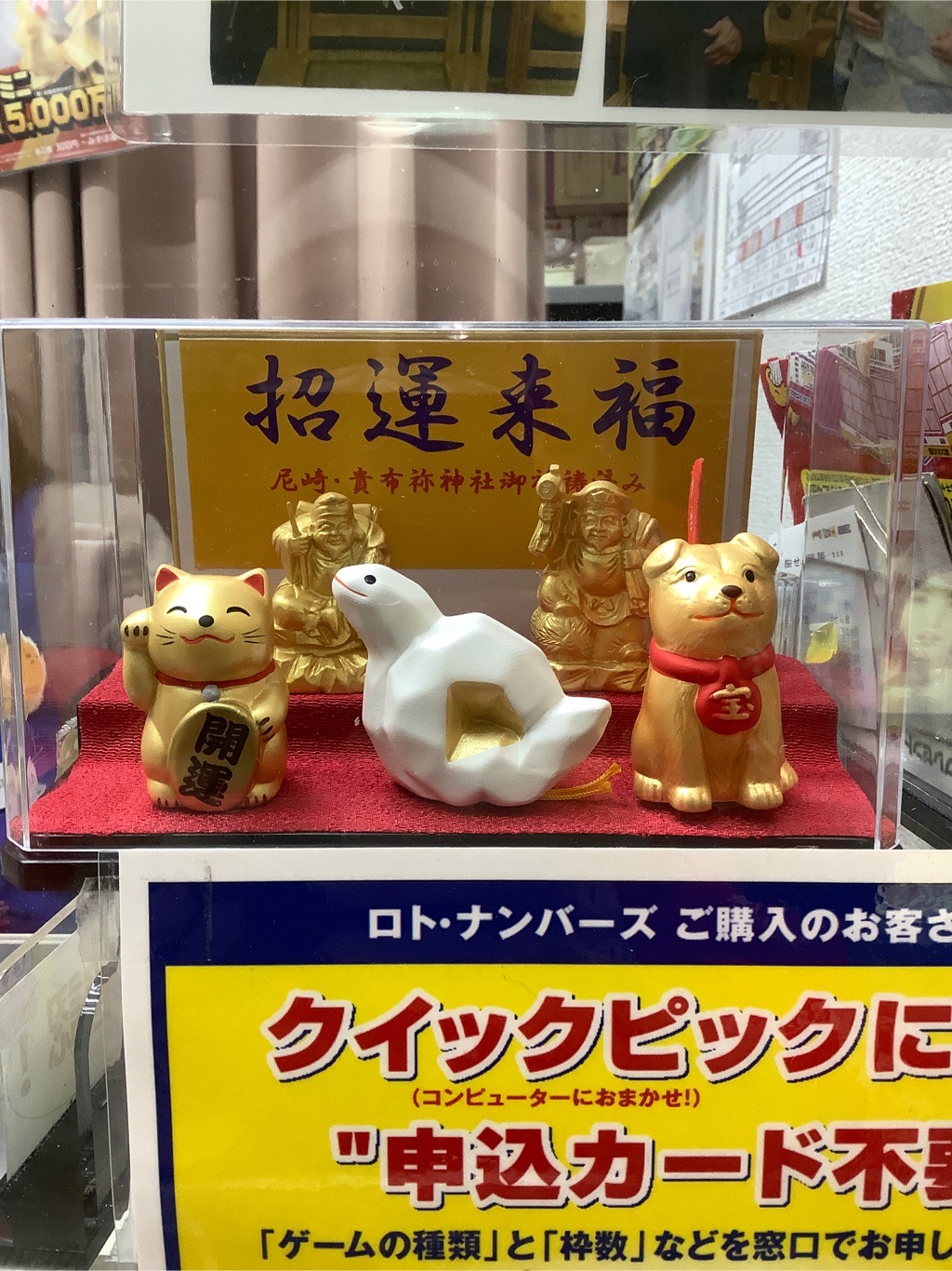 当売場は尼崎市内10あるチャンスセンターの1つです。市内各チャンスセンターでは「尼崎の総氏神」である「貴布祢神社」で祈祷して頂いた「招運来福5点セット〔ちっちゃな恵比寿さまとちっちゃな大黒さま・小判付招き猫・金運の白ヘビ・あたり犬〕がお客さまをお迎えしております。