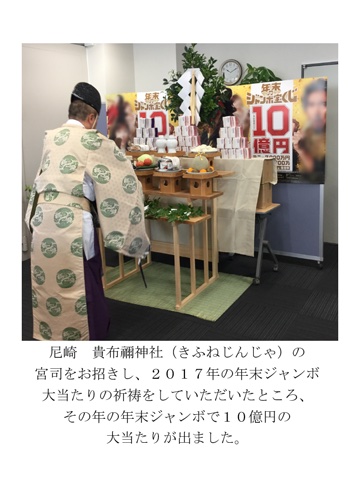 2017年11月には、売場から6km南東、阪神尼崎駅近くにある貴布禰(きふね)神社の宮司をお呼びし、年末ジャンボの大当たりを祈願いただいたところ、その直後に1等10億円の大当たりが出ました。