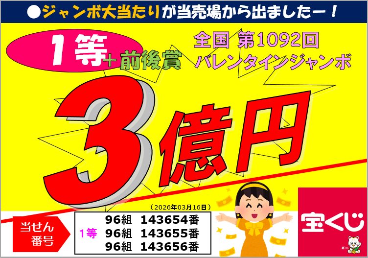 第1092回 バレンタインジャンボ 1等 前後賞合わせて 3億円
