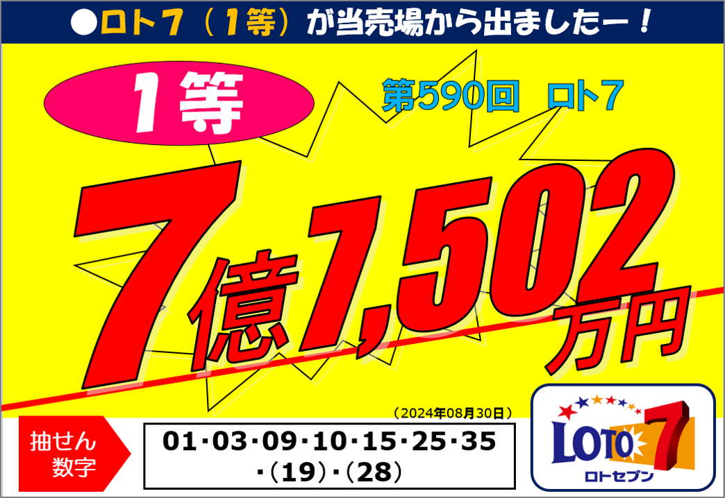 次は と思っていたら、なんと 2024年8月 ロト7 1等 7億が出ました‼