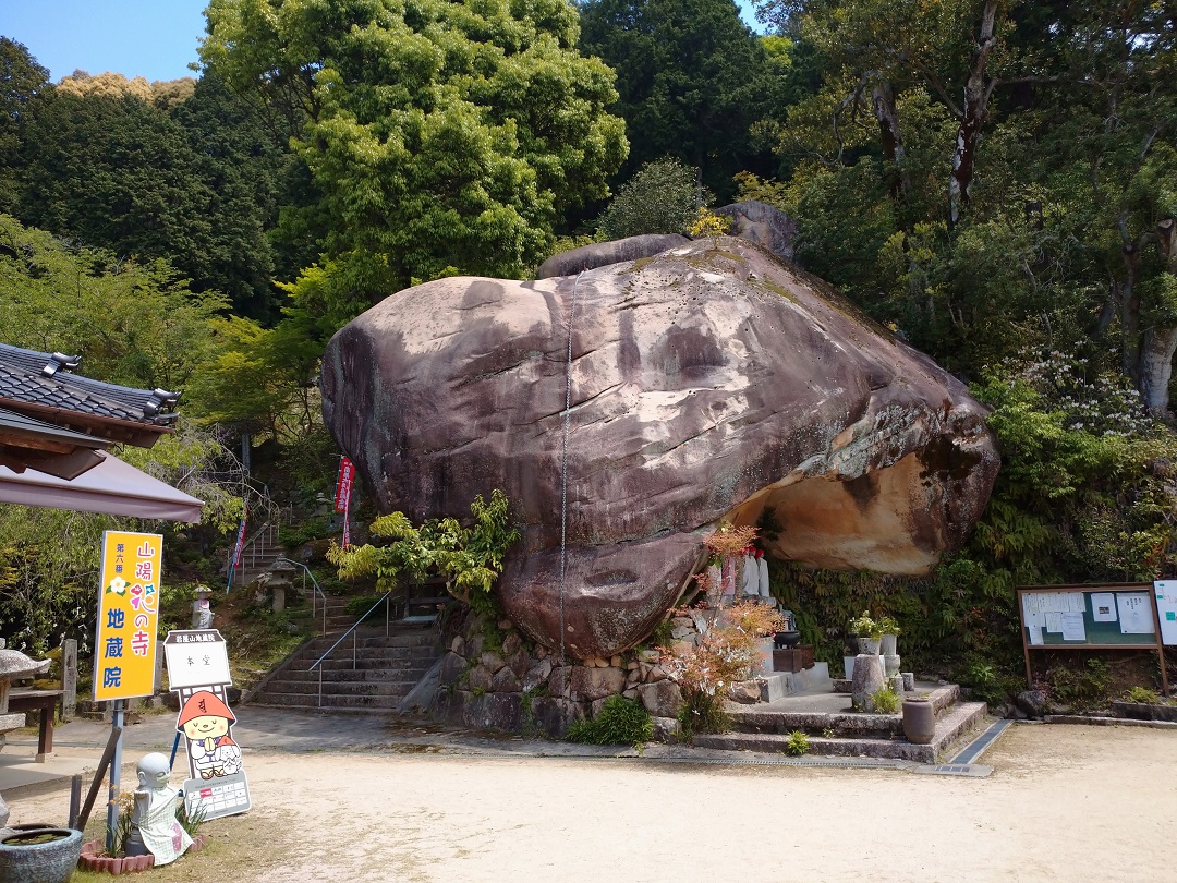 近隣パワースポットは 地蔵院(じぞういん)人面岩。その高さは約10m!岩に吊るされた鎖を使って登ると、頂上にはお不動様が刻まれており、登った人だけが参拝できます。