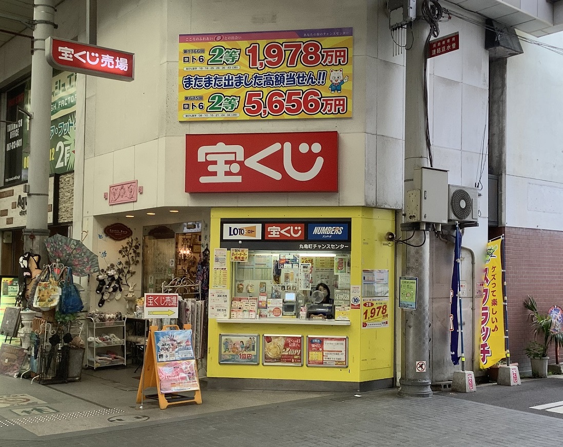 高松市の中心部「丸亀町商店街」にある売場です。総延長約2.7キロのアーケード街は、なんと日本一の長さを誇ります。さらに丸亀町商店街のアーケードドームの高さ32mも日本一です。ショッピングや飲食が一日中楽しめ、たくさんの人で賑わう活気ある商店街、街ブラの際には宝くじ売場にもお寄り下さい。宝くじでも日本一を狙いましょう!エンジョイ!宝くじ!お待ちしております。