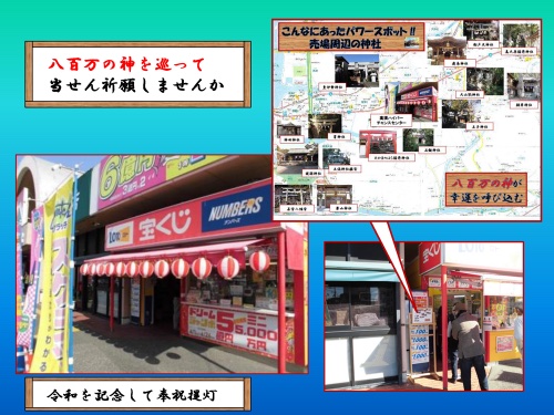 売場には八百万の神からの幸運を授かるために15社(祠)の案内図を掲示、多くのお客さまに興味津々ご覧いただいております。15社を拝んだ販売員とジャンボ販売時を中心に始めました奉祝提灯飾りが皆さまをお迎えしております。