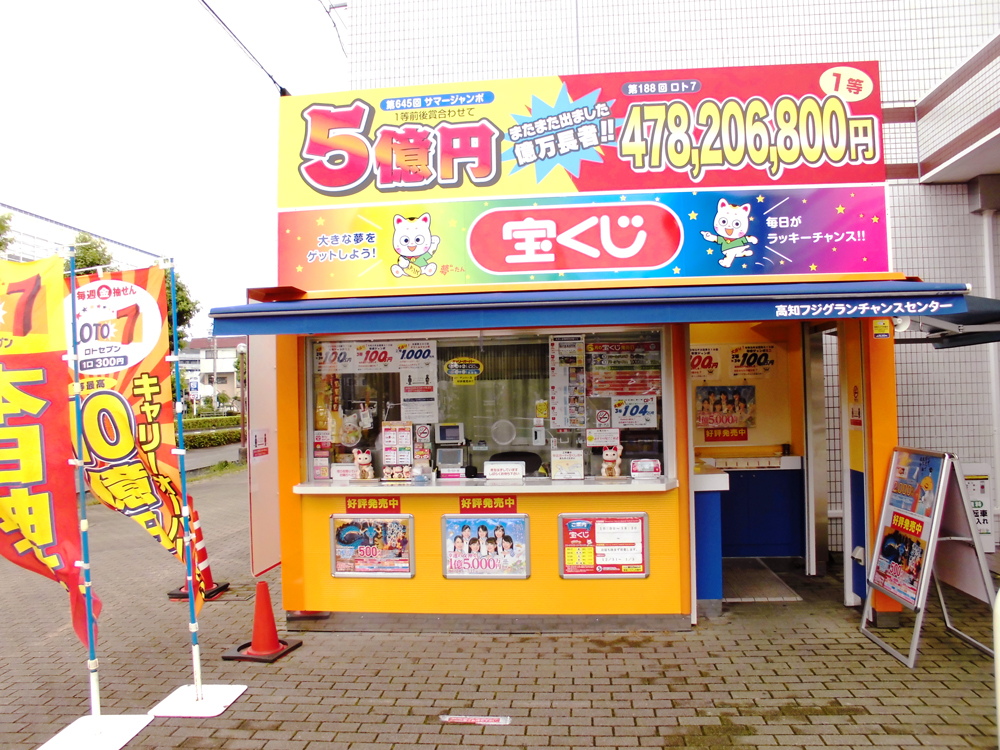 高知市西部、土佐道路から見えるフジグラン高知の南側出入り口横(ミスタードーナツ前)にある、数多くの高額当せんがでている幸運の売場です。